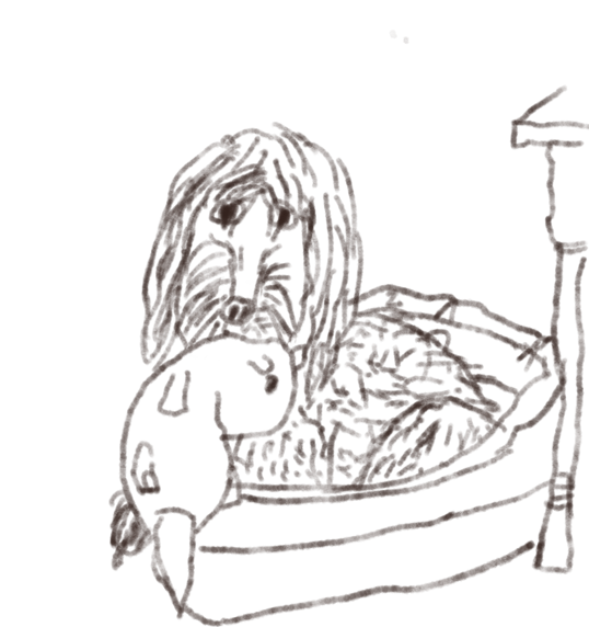 She normally follows us up and lies on the bed until everyone else is ready, then gets a treat for going into her own bed, which is on the landing – when she was young and I tried to get her to sleep in the kitchen as previous dogs had done, she cried until I gave up and she started to sleep on the landing.