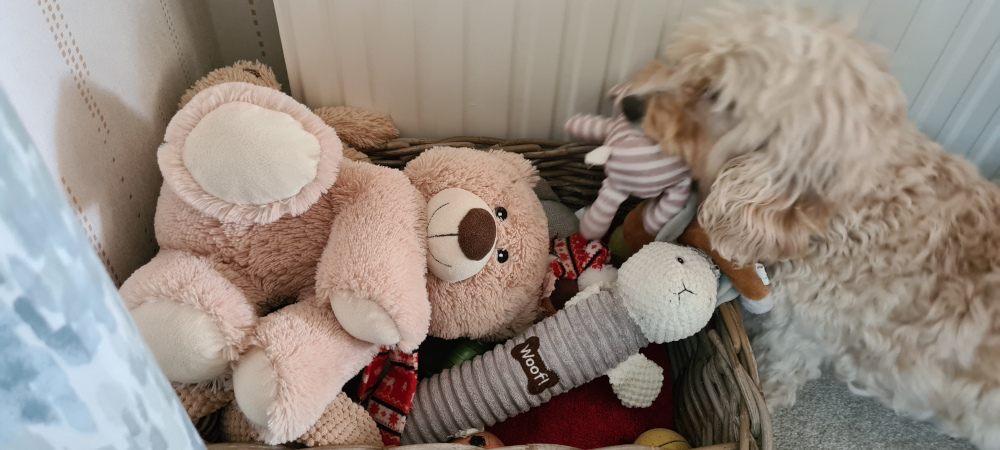 Indy gets lots of new toys but never has many at any one time, as she’s chewed them all up.